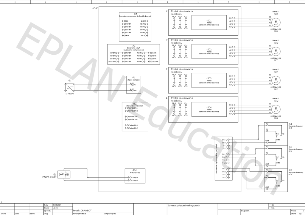 - układ napędowy: silniki krokowe z dedykowanymi sterownikami oraz moduły zasilania i złączami;