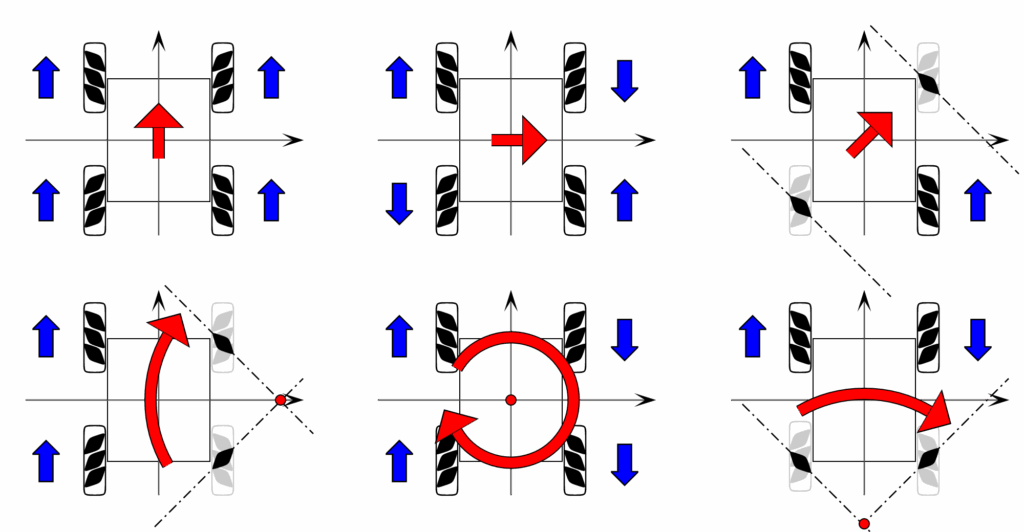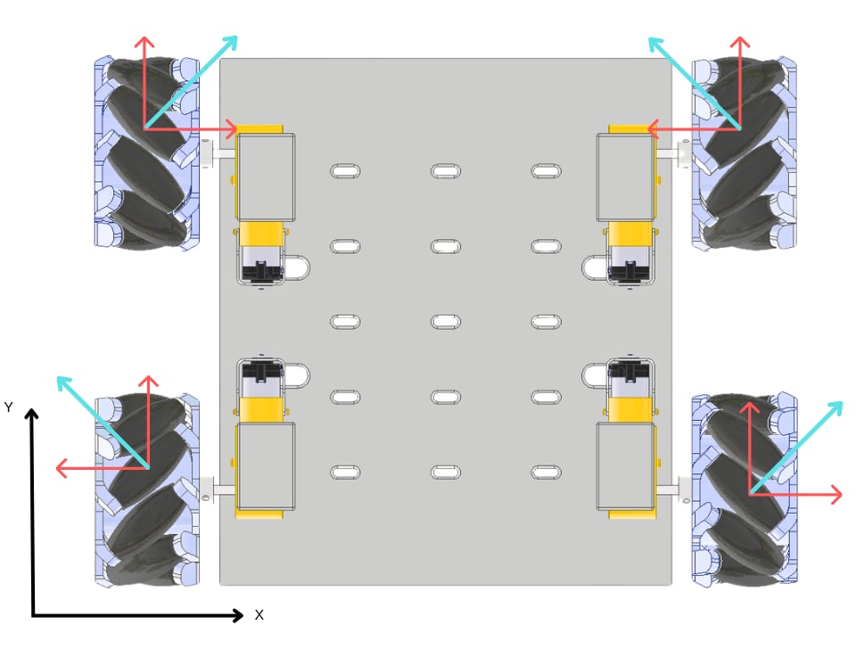 Siła kontaktu z podłożem jest prostopadła do osi obrotu rolki. Po rozłożeniu tej siły na składowe w układzie współrzędnych x i y otrzymujemy dwie prostopadłe składowe o jednakowych wartościach bezwzględnych. Analizując rozkład sił dla koła lewego i koła prawego (przy ich zgodnym kierunku obrotów) można zauważyć, że składowe wzdłużne mają ten sam zwrot, natomiast składowe poprzeczne mają przeciwne znaki. W konsekwencji jednoczesne obracanie wszystkich czterech kół w tym samym kierunku powoduje ruch pojazdu wyłącznie w kierunku wzdłużnym (do przodu lub do tyłu). Wynika to z wzajemnej redukcji składowych poprzecznych – wtedy ich suma wynosi zero.
